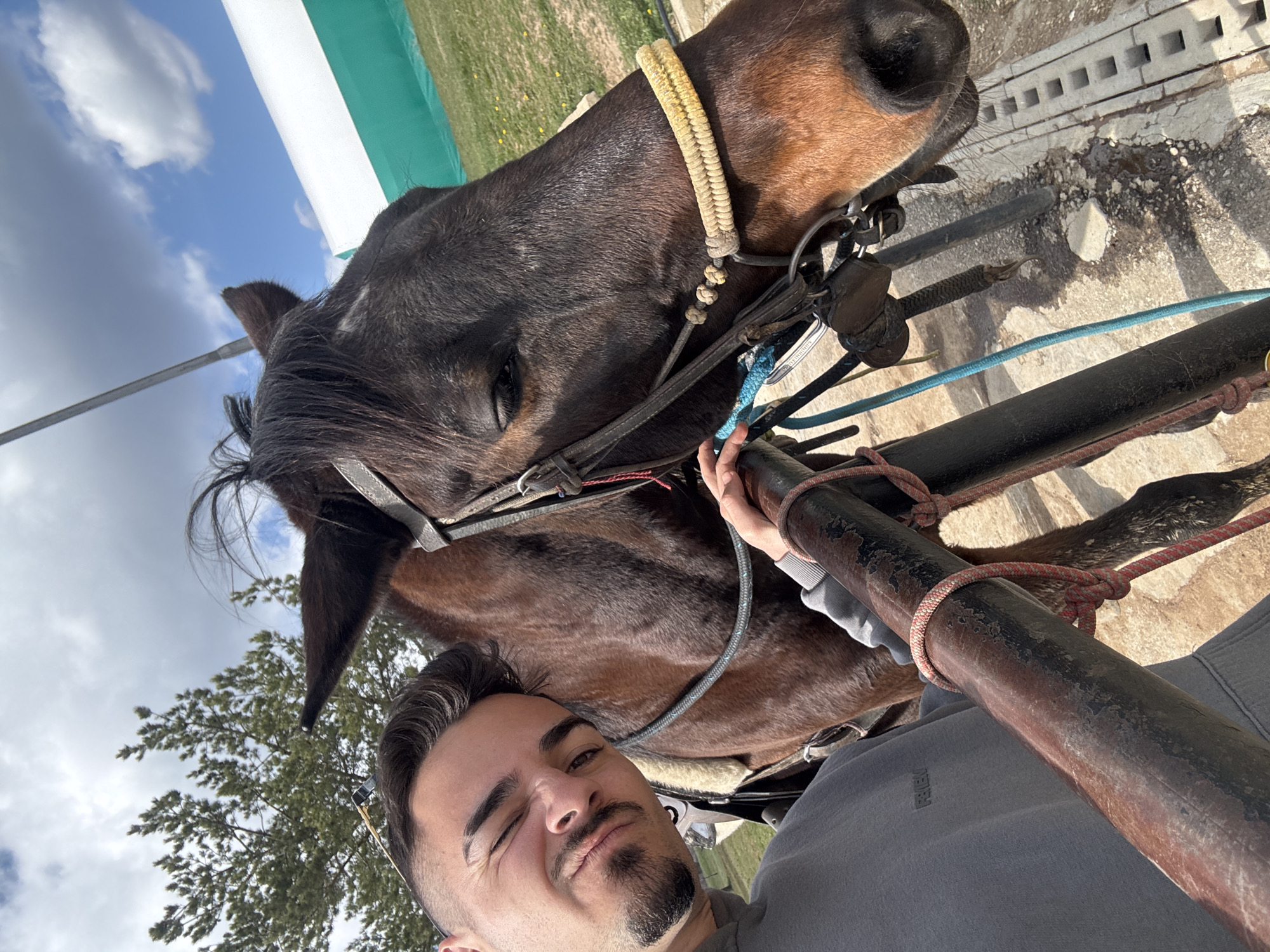 A selfie shows a man with dark hair and a goatee, winking, along with a brown horse in a harness