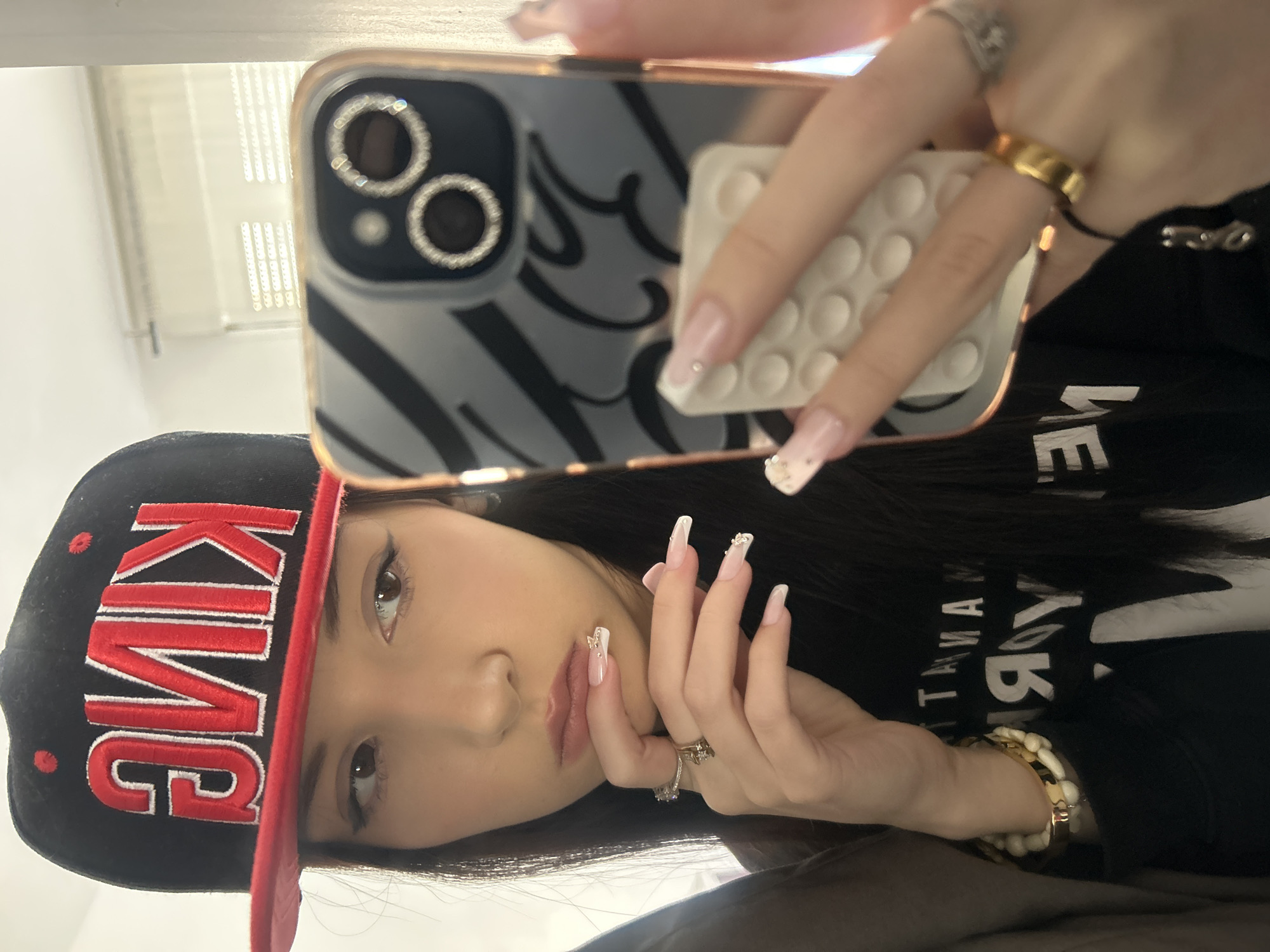 A young female, likely in her late teens or early twenties, is depicted capturing a mirror selfie indoors in the city of Cachan, France. She wears a black baseball cap with the word "KING" embroidered in red and white on the front, worn backward, causing the text to appear mirrored. Her dark hair is long, and she wears winged eyeliner. She is dressed in a black long-sleeved top with white text that appears mirrored, likely reading "NEW YORK" when viewed normally. Her left hand is positioned with the index finger resting on her lower lip, displaying a pensive or contemplative pose. This hand features several rings: a silver-toned ring with small stones on the ring finger and a darker, possibly bronze or gold-toned, ring with a distinct design on the middle finger. Her nails are long, manicured in a French tip style, and adorned with small rhinestones or embellishments. Her right hand holds a smartphone, obscuring part of her face from the lower right. Her right wrist is accessorized with a gold-toned rigid bangle and a bracelet composed of light-colored beads. Her right hand also wears a thick gold-toned band on the index finger and a silver-toned ring with small stones on the ring finger. Her nails on this hand also feature a French tip manicure with similar adornments. The smartphone appears to be an iPhone model, distinguished by its two rear camera lenses which are encircled with small, clear rhinestones. The phone is enclosed in a case with a rose gold or copper-colored trim and a black and gray abstract or wave-like pattern on its back. A white, circular pop-socket or grip aid with a grid of small indentations is affixed to the back of the phone case, held by her fingers. The background is a soft-focus reflection of an indoor setting. A light-colored wall is visible, along with a window fitted with horizontal blinds, allowing natural light to enter the room. The overall lighting is bright and even.
