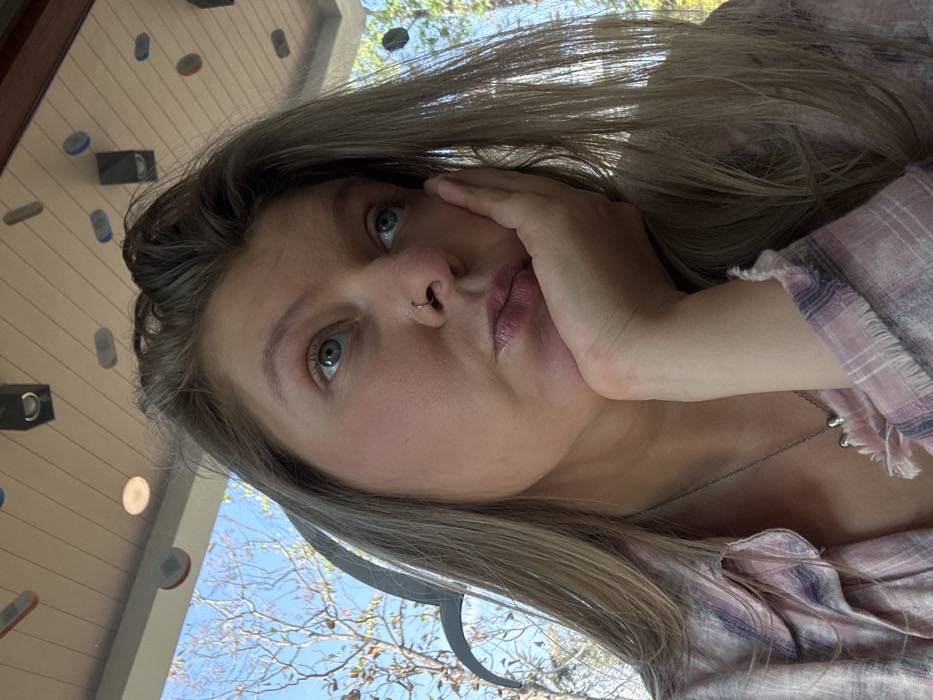 An overhead-angle portrait captures a single female subject in what appears to be a semi-outdoor or open-air structure in San Phra Net, Thailand. The subject, positioned centrally, has fair skin, long light brown hair, and blue eyes. She wears a small, circular septum piercing and a light pink and white plaid shirt with frayed cuffs, along with a thin silver necklace featuring a small pendant. Her right hand supports her chin, with her fingers lightly curled against her cheek. Her gaze is directed upwards and slightly to the right, lending a contemplative or pensive expression. The visible background consists of a light-colored slatted or paneled ceiling with multiple recessed circular lights, black rectangular fixtures resembling speakers or lights, and various small, flat, multi-colored (red, blue, grey, orange) oval and rectangular objects attached to the ceiling. Beyond this structure, a clear blue sky with some bare tree branches and sparse foliage is visible, indicating an outdoor setting during daylight hours.