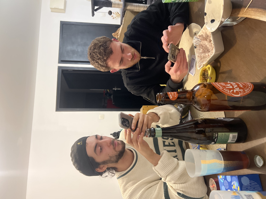 Two men sit at a table filled with empty beer bottles, a dish of dip, and cards. Both men are using their phones. The man on the left wears a black beanie and a white sweater with green stripes. The man on the right wears a black jacket. A dark door is visible in the background. The scene suggests a casual gathering or a social event.