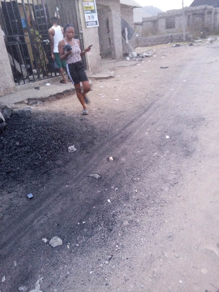A street scene shows a woman walking, focused on her phone. She wears a tank top and dark shorts with white stripes. Behind her, a man in a white tank top and dark shorts stands near a black gate. The street is a mix of dark, possibly burned material and light-colored sand. Debris is scattered around. In the background are buildings under construction and a distant hill.