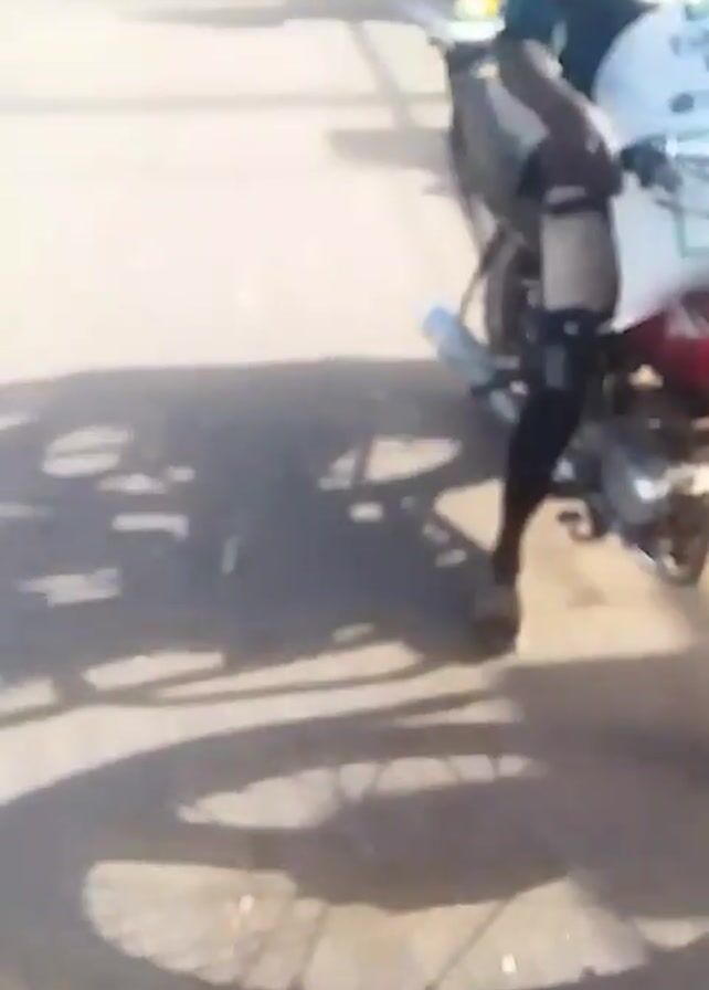 The video depicts a sunny outdoor scene on a paved surface. A man on a red motorcycle with a white bag is the focal point, passing by people selling watermelons spread out on the ground. The scene suggests a roadside market. Other individuals are visible in the background.