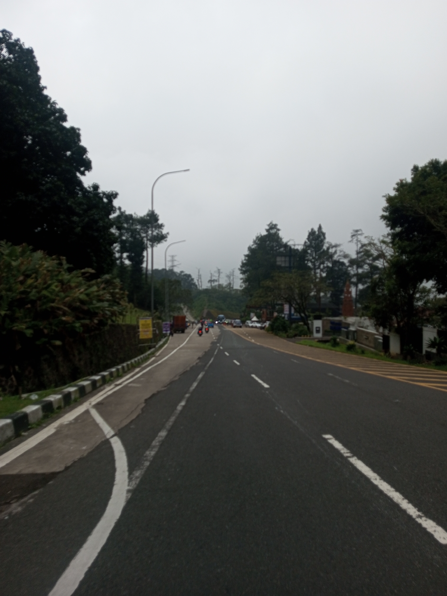 road in Mae Chan District, Thailand. The road is paved and has white lines marking the lanes. There is a sidewalk on the left side of the road. There are trees and vegetation on both sides of the road. In the distance, there are vehicles and people. The sky is overcast. There are also streetlights visible.