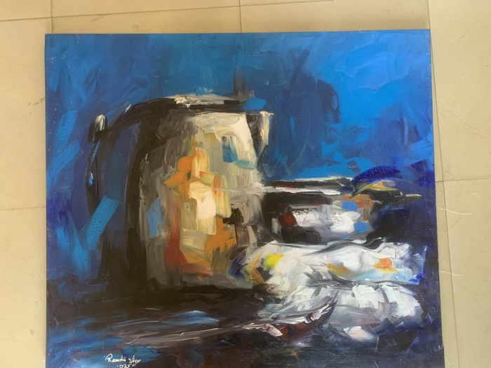 This image depicts a rectangular, abstract-impressionistic oil painting resting flat on a light-colored, tiled floor with visible grout lines. The painting features a dominant, stylized object resembling an electric kettle or an abstract structure, rendered in dark blues, whites, and warm orange-yellow tones, positioned towards the left-center of the canvas. To its right and beneath it, a stack of white, grey, and subtly colored abstract forms are depicted. The background and foreground of the painting consist of varying shades of deep blue, with lighter blue accents and darker tones at the base. The artist's signature, "Remi Jaji," and the year "2023" are visible in white paint at the bottom left corner of the canvas. This scene is located in Kabong, Nigeria.