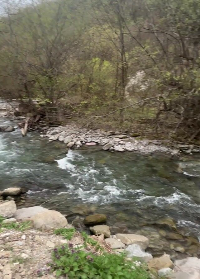 moderately fast-flowing river cascading over rocks, cutting through a landscape of trees and vegetation. The water is clear enough to see the riverbed in places. The banks of the river are lined with large rocks and green vegetation, with trees on both sides. The trees appear to be in early spring, with some showing new leaves and white blossoms. The sky is overcast, suggesting a dull or cloudy day. There is some trash on the riverbank.