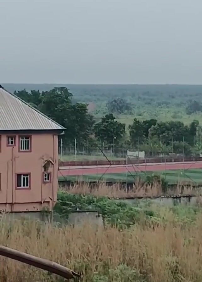 From an elevated position, the video shows a sports field, possibly for soccer, with green turf and red track. A house with a black roof is situated in the background, amidst trees and vegetation. The foreground contains overgrown grass and part of a building on the left edge. The sky is overcast and gray. As the video progresses, the view zooms out slightly, revealing more of the landscape.