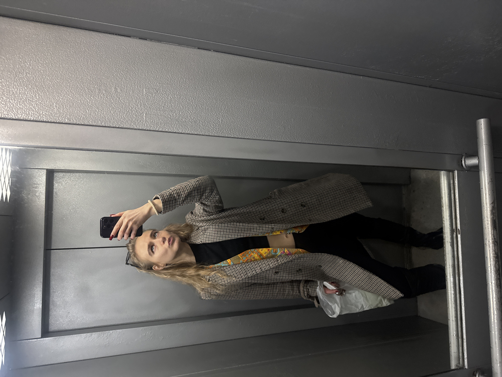 A woman is taking a selfie in an elevator. She is wearing a black top, black pants, and a brown plaid blazer. She is holding a black smartphone in her right hand. A plastic bag is in her left hand. The elevator interior is gray.