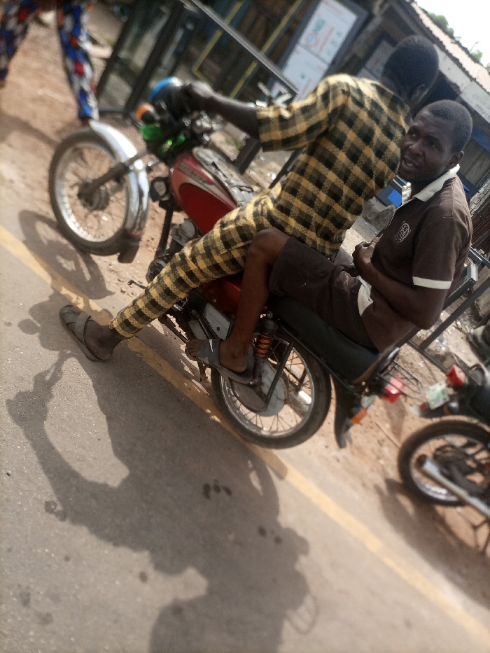 An outdoor scene in Adankolo, Nigeria, depicts two adult males on a red motorcycle stopped on an asphalt road with a faded yellow painted line