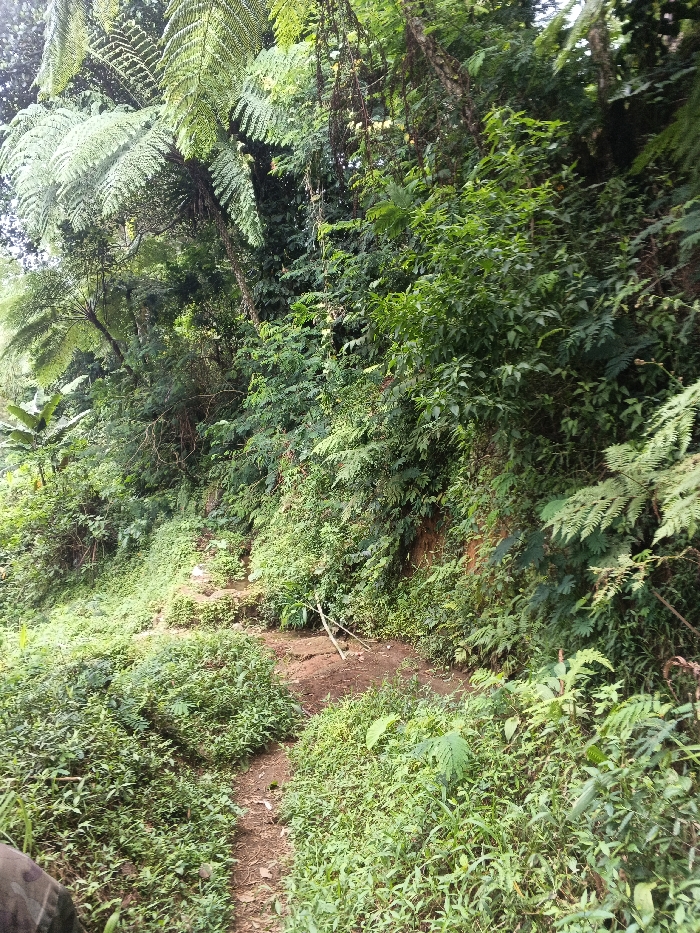 The image depicts a narrow dirt path winding through a densely vegetated, natural environment in Buyantashi, Zambia. The path originates from the foreground, ascending a gentle slope towards the upper-left quadrant. The ground and the inclines on both sides of the path are heavily covered with various types of green foliage, including numerous ferns with large fronds, smaller bushes, and trees forming a canopy overhead, creating a lush, overgrown setting. Exposed reddish-brown soil is visible along the path and where the terrain rises more steeply on the right. Approximately midway up the visible path, on the right side, two light-colored sticks or branches lie crossed on the ground. Further up the path, on the left, a small collection of lighter-colored debris or refuse is present. No individuals are visible within the frame, though a dark-colored fabric object, possibly part of a garment or bag, is partially visible in the bottom-left corner, indicating a close perspective to the ground. The scene is devoid of any apparent human structures or significant human activity.