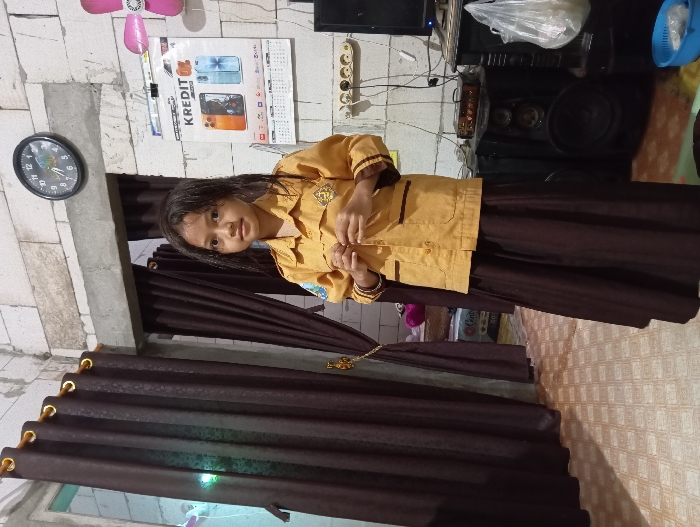 A young girl in a school uniform with a brown skirt and tan top stands indoors, near dark brown curtains. Behind her, the wall is textured. To the left, a clock hangs on the wall. Behind her, there is an electronic device and a calendar, as well as other household items. There is also a pink fan on the top left.