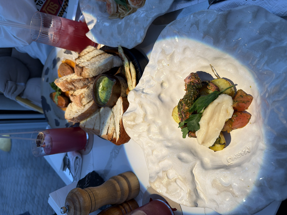 The image depicts a dining table scene at a restaurant
