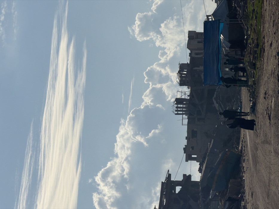 A scene depicting a war-torn urban landscape is dominated by ruined buildings. Debris and skeletal structures are visible. People are walking through the scene. A blue tarp structure is on the right. The sky is filled with white clouds.