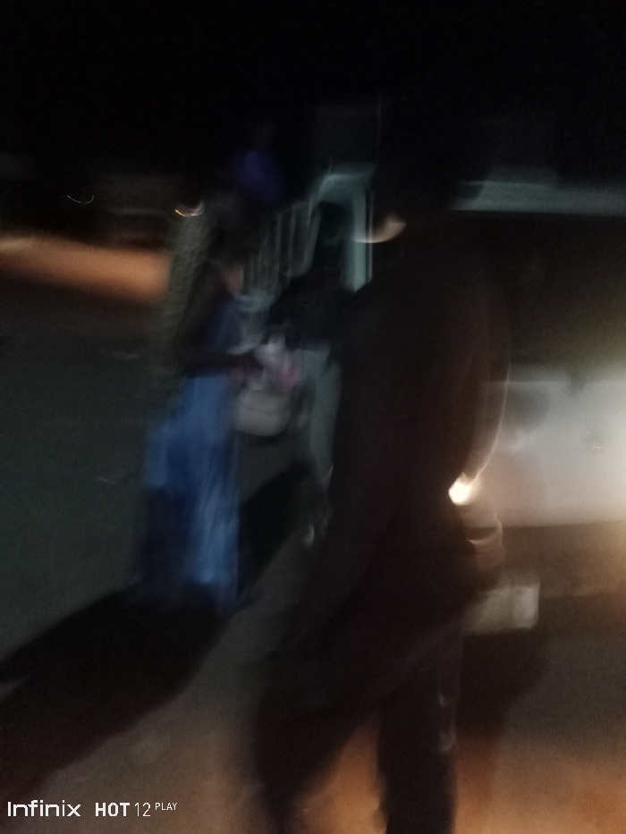 A blurry nighttime scene depicts two indistinct figures standing near a light source. One person wears a blue dress and appears to be holding something. The second person is dark and obscures much of the background. A building structure is faintly visible behind the figures. The overall image suffers from significant motion blur, rendering details difficult to discern.