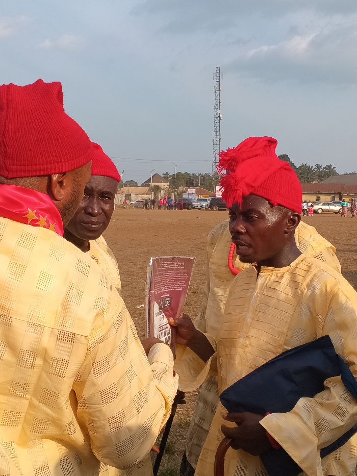 Four men wearing red hats and yellow robes gather outside. One man holds a leaflet or brochure. A communication tower rises in the background. In the distance, a crowd congregates on a large open area with parked vehicles. The sky is overcast.