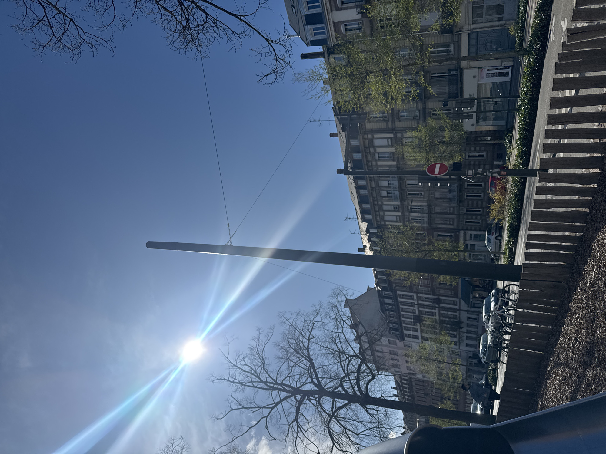 The image depicts a sunlit urban street scene in the City of Unknown, Unknown. A clear, bright blue sky with minimal cloud cover dominates the upper portion, featuring a prominent sun flare originating from the upper-left, casting visible light streaks. In the foreground, a curved, blue-grey structure, possibly a slide, is partially visible on the left. A low fence constructed from vertical, dark wooden posts delineates a mulched ground area from a paved road that runs horizontally. The midground features a street with multiple parked vehicles, including several light and dark-colored cars, and a cluster of approximately 5-7 parked bicycles. A single individual, wearing a light-colored jacket, walks on the sidewalk from left to right. A tall, dark, cylindrical street pole rises prominently from the midground, slightly right of center, extending towards the top of the frame. Overhead wires are visible against the sky. A red circular prohibitory traffic sign, likely a "no entry" symbol, is mounted on a pole to the right of the road. Green shrubbery and trees with both bare branches and nascent leaves line the street. The background consists of a continuous row of multi-story buildings, approximately 4-6 floors tall, displaying classical architectural elements such as numerous windows, some with shutters, small balconies, and dark, sloped roofs with dormer windows. The building facades exhibit varying shades of grey, brown, and off-white.