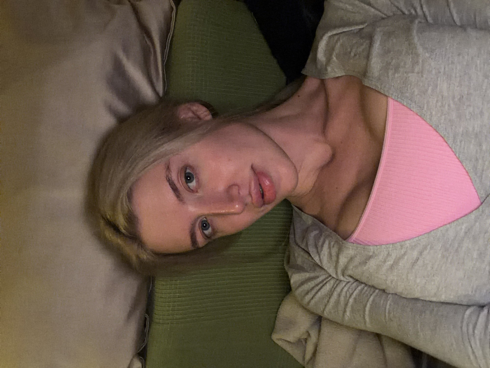 A close-up, head-and-torso portrait features a female individual with blonde hair, fair complexion, and blue eyes, looking directly at the camera with a neutral expression. Her lips appear full. She is wearing a light pink ribbed tank top beneath a light grey long-sleeved top with ruched detailing on the shoulders. The individual is positioned against soft furnishings in an indoor setting. Behind her head is a light brown, possibly satin, pillow or cushion. Below this, a green ribbed fabric, consistent with upholstery, forms the immediate background. A lighter, beige or off-white fabric object is visible to the subject's left (viewer's right), and a dark, possibly black, fabric element is partially visible to the subject's right (viewer's left). The lighting is soft and diffused. The specific location within the city of Nerin, Montenegro, is not ascertainable from the visual evidence presented in the image. No other individuals or actions are depicted.