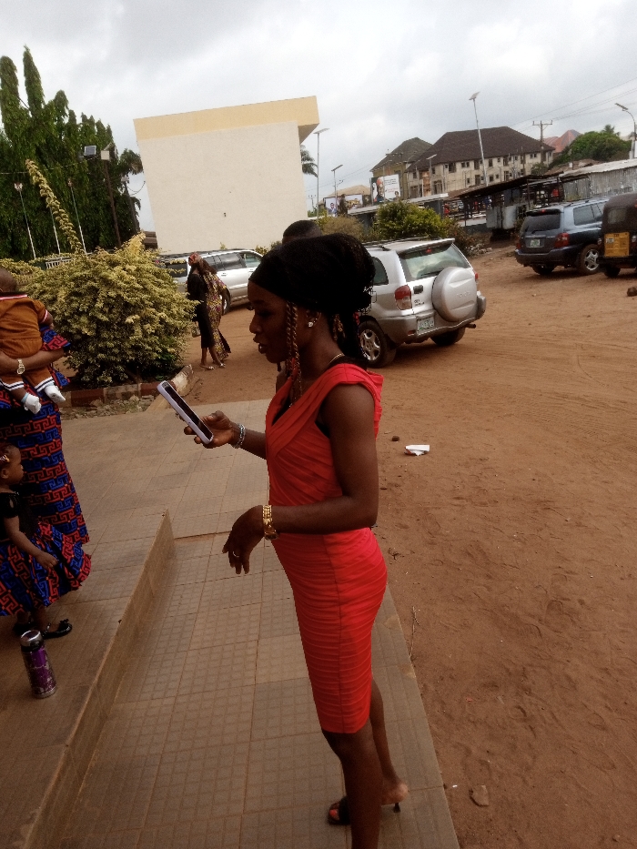 An outdoor scene in Nsugbe, Nigeria, depicts a woman in a form-fitting red ruched dress and a voluminous black headwrap, viewed in right profile