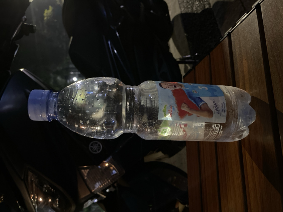 The scene is set at night in Kecamatan Pati, Indonesia. A clear plastic Le Minerale water bottle stands upright on a dark brown wooden slatted surface. The bottle is partially filled with liquid, and its exterior displays condensation droplets. It is sealed with a light blue plastic screw-top cap. The label on the bottle features the "Le Minerale" brand, a "BPA FREE" designation, and an illustration of a jubilant male figure in a light blue jersey with the number "3" against a red and white background. Text including "Zay Izzan Pati Tengah, Pati, Tengah" is also visible on the label. In the blurred, dimly lit background, the front section of a dark-colored Yamaha motorcycle, identifiable by its logo and headlight assembly, is visible to the left, while other indistinct dark objects and distant ambient lights are present. No people or overt actions are depicted.