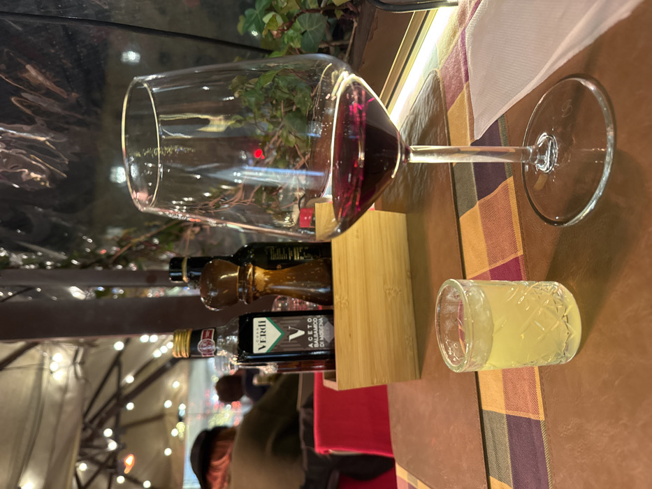 A wine glass with red wine sits tilted on a table alongside a small shot glass filled with a yellow liquid, possibly Limoncello. Nearby is a wooden stand holding bottles of balsamic vinegar and olive oil. The table is covered with a checkered cloth. An outdoor setting with lights and greenery is visible in the background.