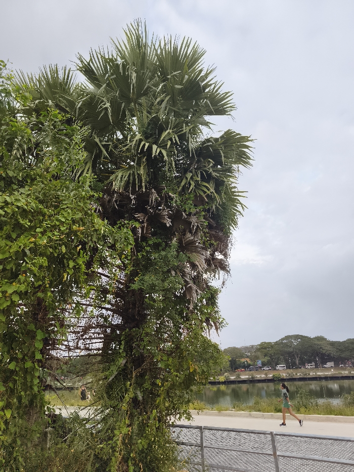 The scene depicts a lakeside environment in Baan Chaweng, Thailand, under an overcast sky. In the foreground on the left, a large palm tree with prominent fan-shaped fronds is heavily integrated with dense green foliage and climbing vines, which also obscure a metal structure or trellis. A light-colored paved pedestrian path runs horizontally across the mid-ground, bordered by a grey metal railing in the lower right. A female individual, dressed in a light green top, dark shorts, dark athletic shoes, and a face mask, is observed jogging from right to left on this path. Beyond the path and railing, a calm body of water, presumably Chaweng Lake, extends towards the background. The far bank of the lake features a grassy verge, a line of mature trees with dense canopies, and a distant area with parked vehicles and what appear to be low-lying buildings or structures.