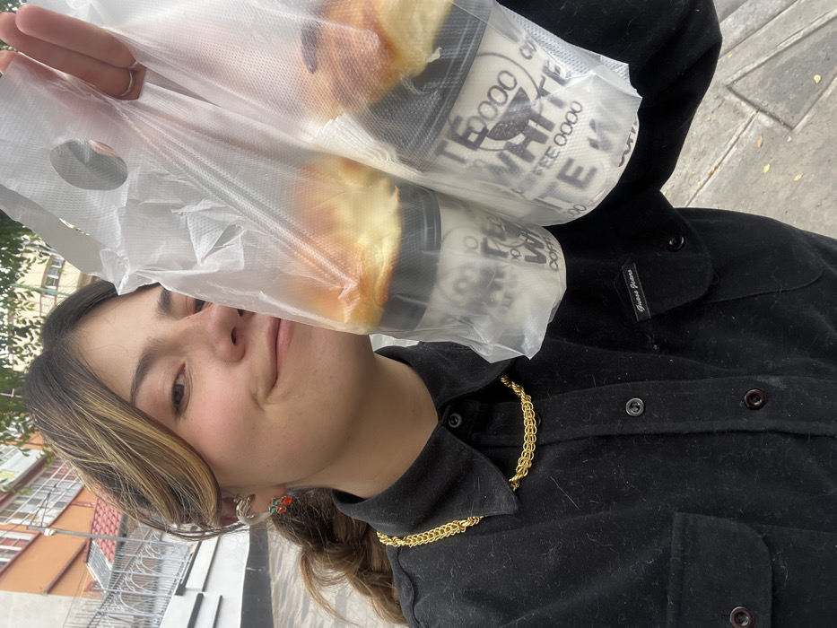 A young woman holds a plastic bag containing two cups of "Tea White Coffee" in front of her face