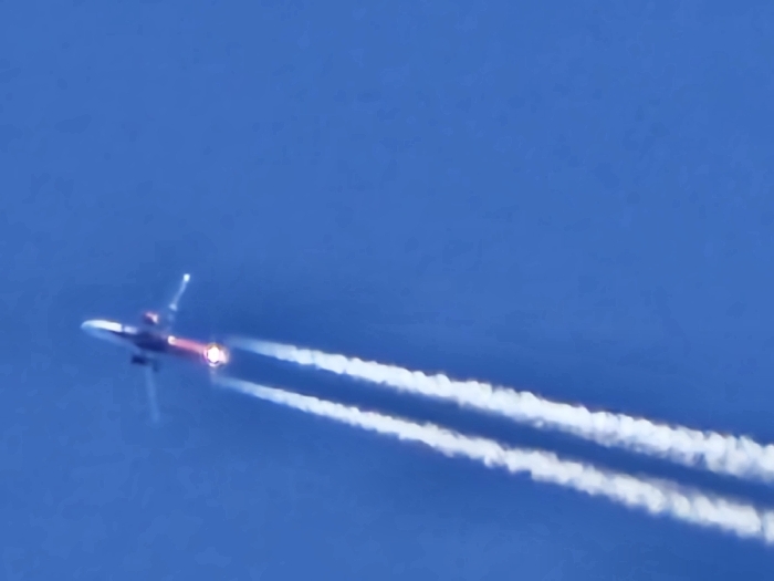 - "A white and red airplane soars across a clear blue sky, leaving behind two thick white contrails" by FM-kxz9i2, licensed under CC BY 4.0
