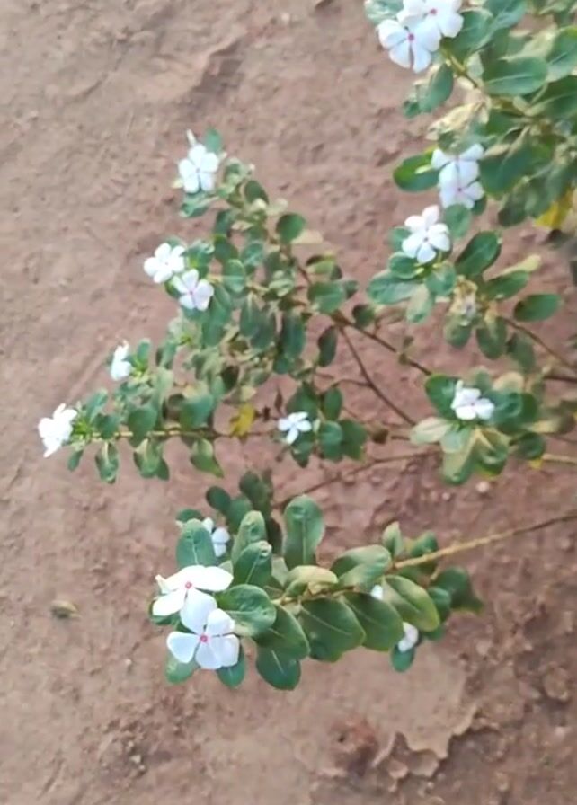 small plant with white flowers and green leaves growing on a brown, sandy ground. The plant is sparsely branched, with the flowers distributed along the branches. The flowers have five petals and a small red center. The leaves are oval-shaped and glossy. The ground is rough and uneven, with a few small stones visible. The lighting is bright and natural, suggesting the video was taken outdoors during the day. There are no people or other objects visible in the video. The camera appears to be stationary and positioned directly above the plant.