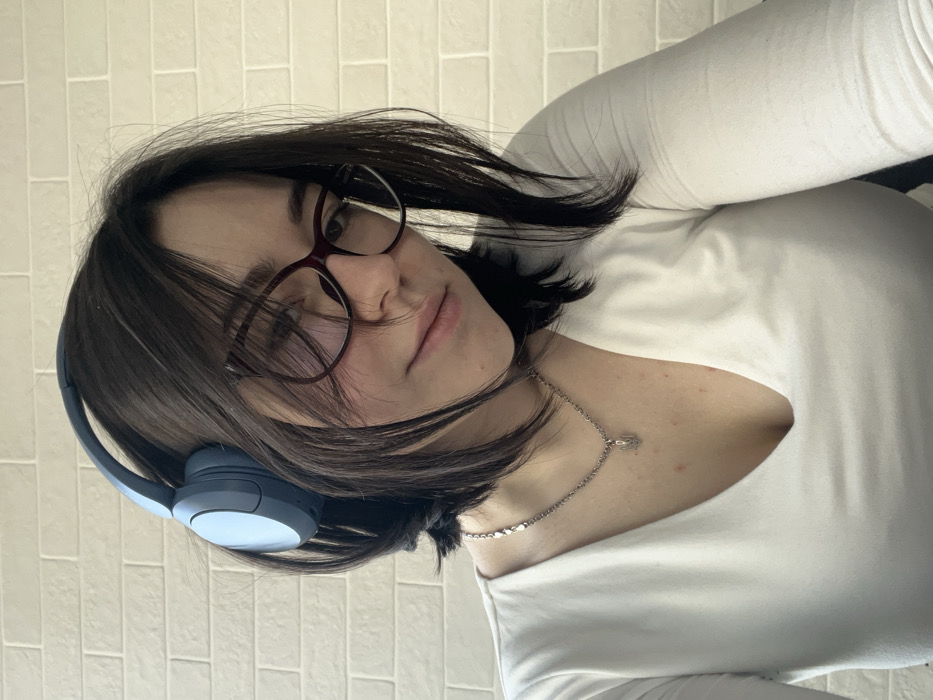 This image depicts a female individual in an indoor setting, specified as Lymanka, Ukraine. The subject is seen from the chest up, positioned against a light-colored, brick-patterned wall. She has dark, short-to-medium length hair and wears dark reddish-brown framed eyeglasses. Blue over-ear headphones are worn on her head, with the left earcup prominently visible. A silver-colored chain necklace is present around her neck, featuring a small pendant resembling the Ukrainian Tryzub. The individual is wearing a white long-sleeved V-neck top. Her facial expression is neutral, and her eyes are directed slightly downward and to the viewer's right through the upper portion of her eyeglasses.