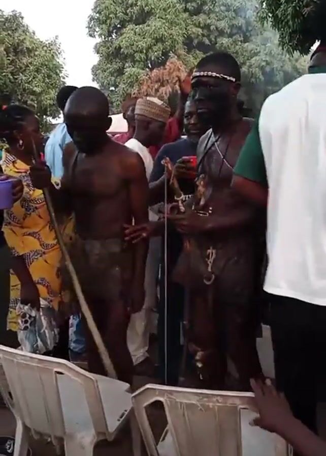 crowd of people gathered outdoors. Two men in what appears to be traditional attire are visible. One is holding a wooden staff while the other is holding a spear. Their faces and bodies appear to be covered in dark paint or material. Other people are nearby, some wearing casual clothing. White plastic chairs are in the foreground. In the background, there are trees and what may be food vendors or stalls. Some individuals in the crowd are interacting with the traditionally dressed men.