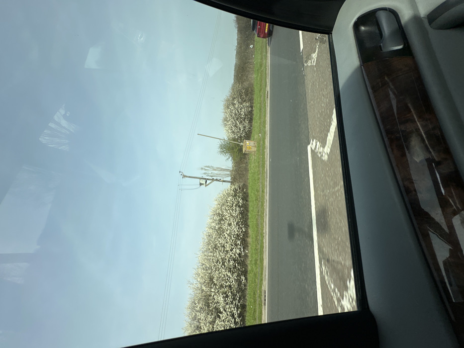 The image depicts an outdoor scene observed from the interior of a vehicle, specifically through a side window