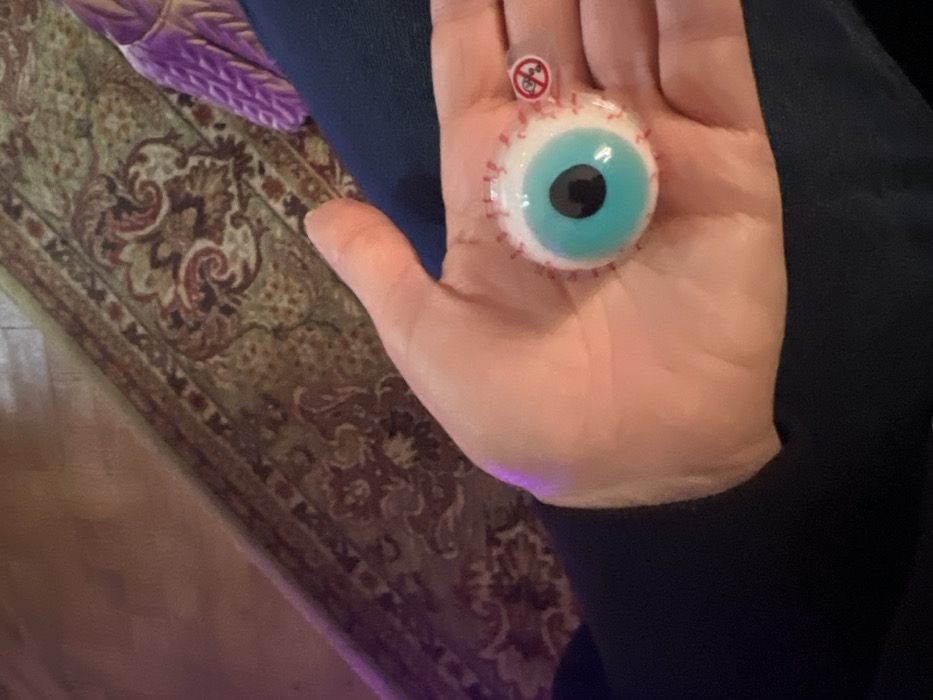 The exact location within the city of Mouscron, Belgium, is not discernible from the image, which depicts an indoor setting. A human hand, positioned centrally, holds a circular gummy candy designed as an eyeball. The candy features a white outer layer, a light blue iris, and a black pupil, encased in clear plastic packaging with red markings simulating blood vessels. A small, circular warning label, primarily red, is affixed to the packaging near the top right. The hand wears a dark, long-sleeved garment. In the background, a patterned rug with intricate olive green, brown, and red designs is visible, alongside a segment of a purple, textured object to the right.