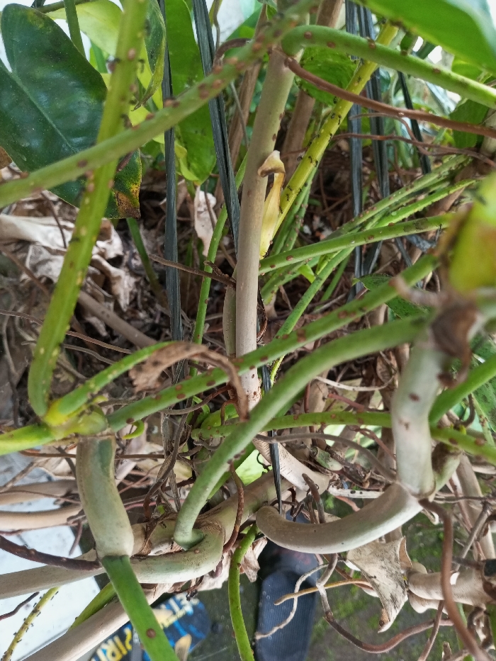 A vertical close-up photograph depicts dense plant growth in an outdoor or semi-outdoor environment, located in Mindat, Myanmar. The scene is dominated by intertwined green and light-brown plant stems, robust aerial roots, and scattered dark green leaves. Multiple green stems exhibit numerous small, dark reddish-brown spots, consistent with natural markings or the presence of scale insects. Several small, dark ants are observed actively moving along and interacting with these green stems, particularly in the central portion of the frame. Thick, pale, light-colored aerial roots are visible intertwining in the lower section of the image. The background contains additional green foliage, desiccated organic debris, and a dark, slender vertical support structure, possibly a stake or trellis. No people are visible, and no active human actions are depicted.