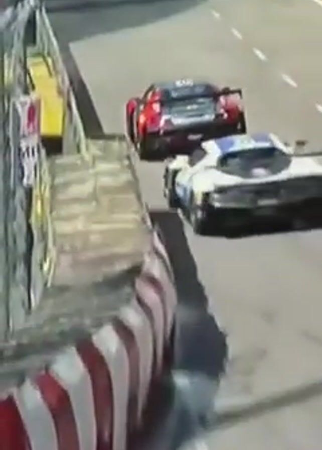 car race with several cars speeding down a paved road. A red and silver race car is in the foreground, followed closely by a white and blue car. The road has white lane markings and is lined with barriers, including some with red and white stripes. The environment suggests an outdoor race track with additional cars visible in the distance.