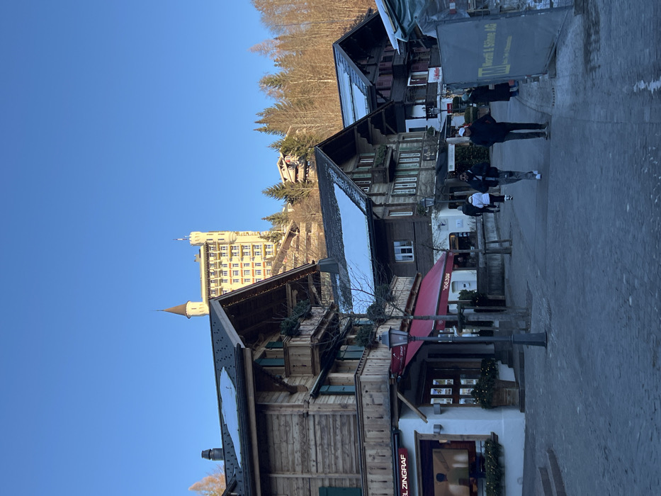 The scene depicts a pedestrian street in Gstaad, Switzerland, with the iconic Gstaad Palace hotel visible on a prominent hillside in the background