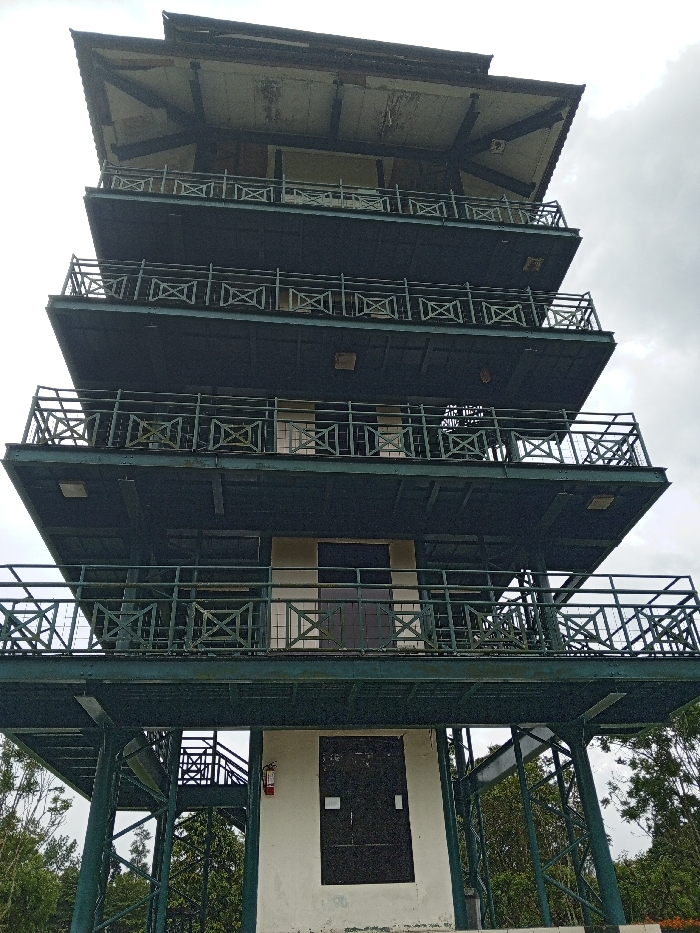 A weathered, tiered observation tower dominates the frame against a cloudy sky. The structure consists of multiple stacked levels, each featuring a balcony with patterned railings. The tower's lower section includes a white, enclosed base with a black door and a visible fire extinguisher. The upper tiers exhibit signs of age and disrepair. It is surrounded by some plants.