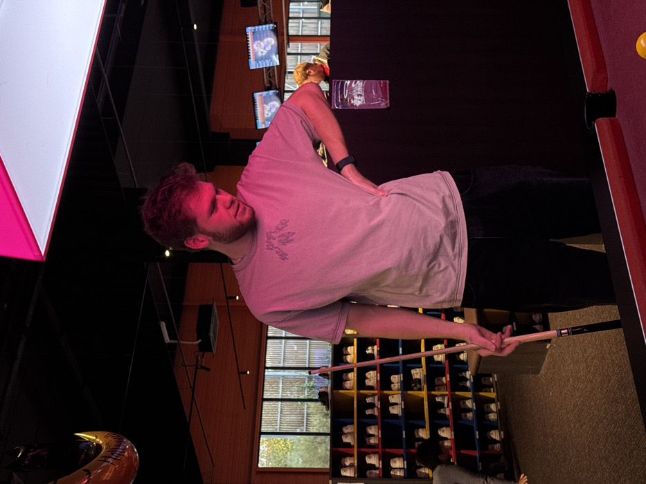 The scene depicts the interior of a leisure establishment, likely Bowlingstar Reichstett in Reichstett, France. A light-skinned adult male, with short brown hair and a beard, stands center-frame under prominent pink-magenta lighting, which casts a hue over his skin and clothing. He wears a light grey t-shirt with a subtle dark graphic design on the chest and dark trousers. His left hand is placed on his lower back/hip, and a dark smartwatch is visible on his left wrist. His right hand holds a wooden pool cue vertically, its tip resting on the carpeted floor next to a red-felted pool table, partially visible in the bottom right, which contains at least one yellow ball. He is looking downwards. To his right, a clear glass is situated on a dark partition. In the background on the left, a multi-colored shelving unit, segmented in yellow, blue, and red, is filled with numerous pairs of light-colored shoes, consistent with bowling footwear. A partially obscured individual is bending down near this shoe rack. In the far right background, two display screens show active graphics, and another individual with reddish-brown hair is partially visible behind a dark barrier. The ceiling is black, featuring overhead white rectangular lights, spotlights, and a large, curved, reflective golden object suspended in the upper left. Walls exhibit both dark and wooden paneling.