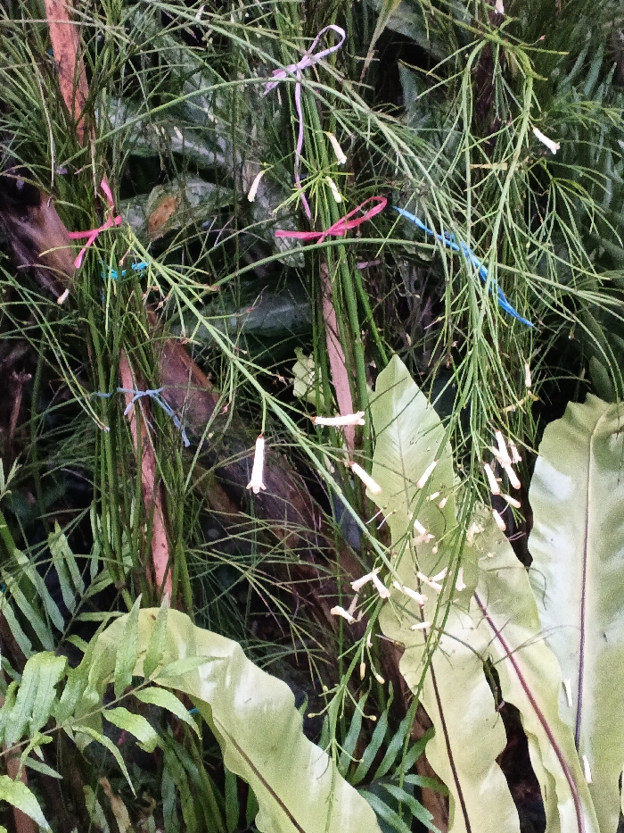 The scene, located in Pea Reang District, Cambodia, depicts a dense arrangement of tropical vegetation. Dominant features include numerous slender, green stems bearing multiple small, pale yellow or off-white tubular flowers. These flowers are elongated and appear to be either buds or newly opened blooms. Interspersed among these flowering stems are broader, light green leaves with undulating edges and pronounced central veins, consistent with fern species. Several small, brightly colored ribbons are tied onto various stems: multiple pink ribbons, some tied as bows, and at least two light blue ribbons tied as simple knots. A darker, reddish-brown plant stalk or tree branch is partially visible in the dense background, obscured by the foreground foliage. No human figures or man-made structures are visible beyond the ribbons. The overall environment is lush, green, and appears to be an outdoor, natural setting.
