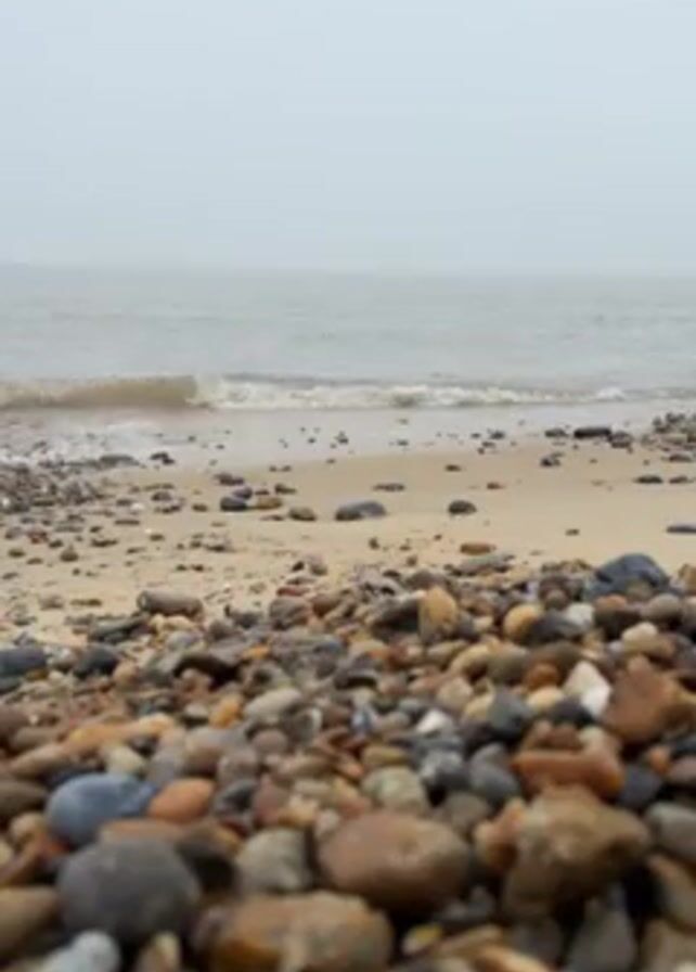 The scene is a beach on a foggy day. The foreground is filled with various sizes and colors of pebbles. Behind the pebbles is a small strip of sand leading to the ocean. The water is grayish and a few small waves are visible. The sky is overcast and blends into the horizon. There are no people visible.