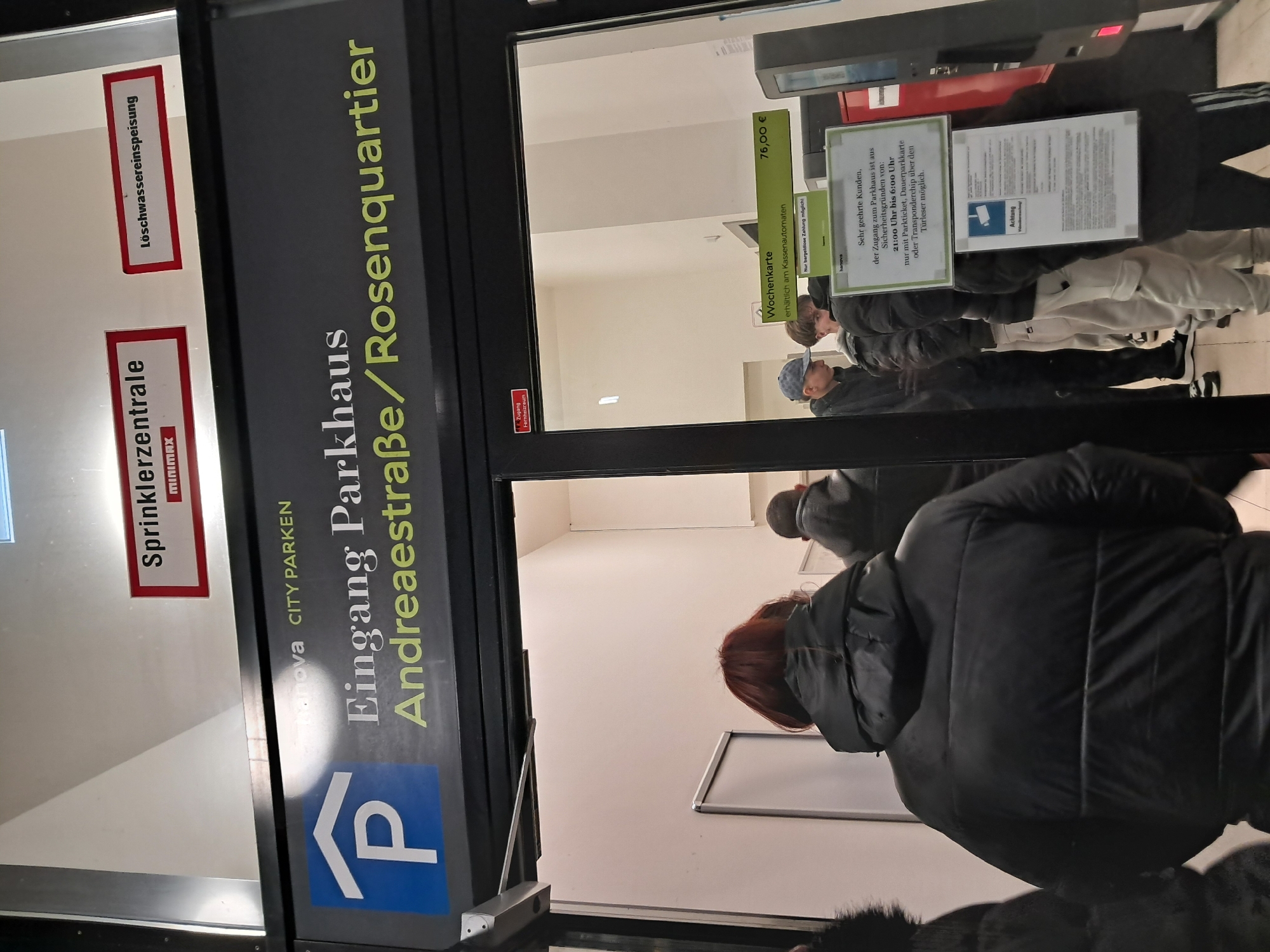Here is a description of the image: The image captures the entrance of a parking garage named "Parkhaus Andreaestraße/Rosenquartier" in an urban setting. The entrance door, which is glass, is partly covered with signs in German. Signs on the left side of the door include "Sprinklerzentrale minimax" and "Löschwassereinspeisung." A large sign on the right side reads "Eingang Parkhaus Andreaestraße/Rosenquartier" above a blue parking symbol. Visible through the glass door are people lined up inside. Most are wearing winter coats, indicating a cold climate. Further signage on the right side inside the door mentions "Wochenkarte" for 76,00 € available at the ticket machine, as well as a notice about the parking garage hours, which are restricted from 21:00 to 6:00, and accessible only with a parking ticket, Dauerparkkarte, or Transponderchip during those hours. There is a CCTV notice. The interior appears clean and brightly lit with white walls.