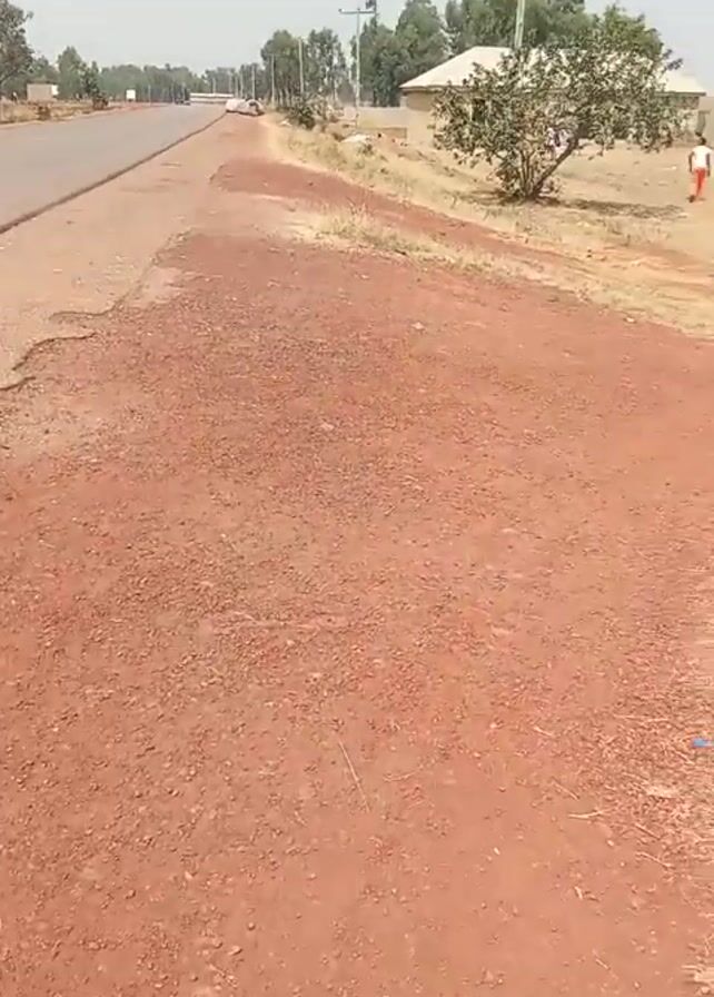 The camera pans from an asphalt road with a wide red dirt shoulder to reveal a dry, grassy field with scattered trash