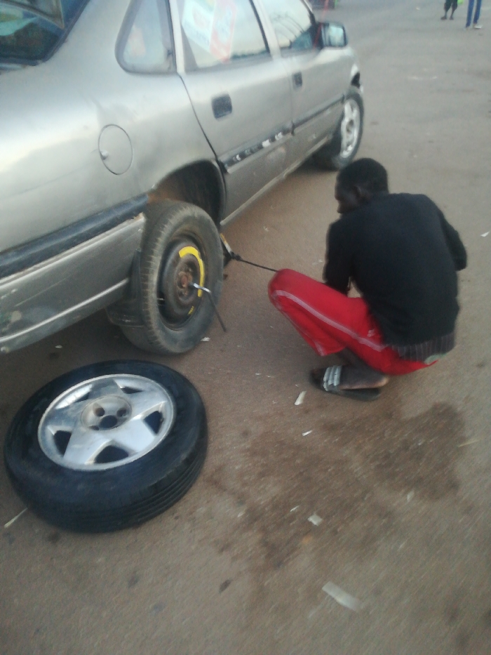 - "A man wearing red pants and a black shirt is changing a flat tire on a silver car" by FM-FCgvq2, licensed under CC BY 4.0