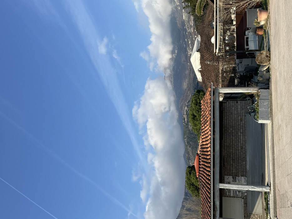 This outdoor scene, set within the city of Budva, Montenegro, depicts a semi-urban landscape under a bright blue sky marked by multiple white contrails and scattered cumulus clouds. In the background, a prominent mountain range features peaks partially obscured by clouds, with some higher elevations showing patches of snow or frost and lower slopes exhibiting sparse green vegetation. Distant structures are visible on the mountain foothills. The mid-ground is dominated by two structures. On the left, a single-story building with an orange-red tiled roof and a distinctive conical vent features an open-sided porch supported by two light-colored square pillars. The back wall of this porch is constructed from light-toned brick, with a rolled-down security shutter covering an opening on the left. A dark-framed bicycle is parked beside a concrete planter containing small green plants in front of this wall. To the right, another building with a darker roof is partially obscured by a pergola-like structure and a large white tent with a pointed roof. The foreground consists of a light-colored paved surface. Various objects are scattered on the right side of the foreground, including several terracotta pots, some containing plants, piles of what appear to be stone slabs or building materials, and a large, irregular natural stone. No people or animals are visible.