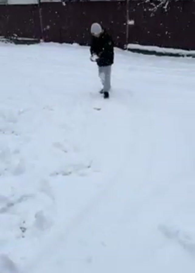 The video starts with a ground-level shot of a brick path covered in snow. The camera then pans up to reveal a person in a black jacket and gray pants running through the snow. The person is holding a snowball and throws it at a fence. The person then falls into the snow near the fence. The environment includes a house, a fence, trees, and power lines. It is snowing.