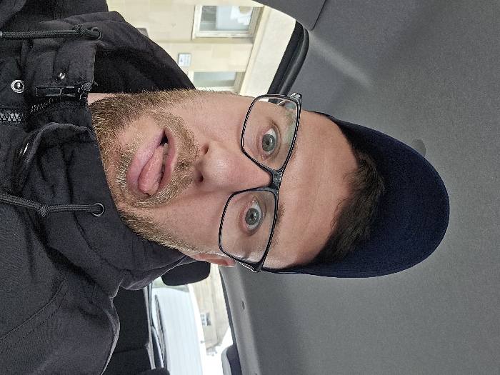 This image presents an adult male in a head-and-shoulders shot, captured from within a vehicle in St Andrews, United Kingdom