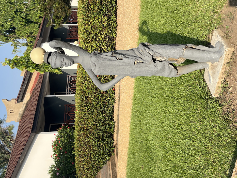 A statue of a person carrying a globe on their head stands on a concrete base amidst green grass