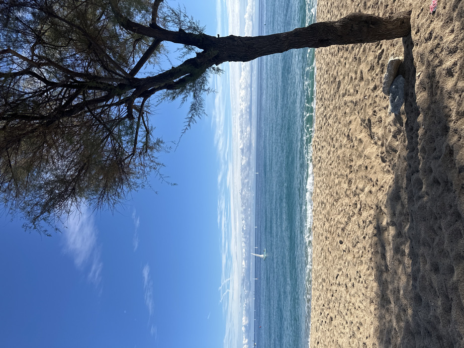 An outdoor scene depicts a beach in Badalona, Spain, under a clear blue sky. The lower half of the image consists of light brown, granular sand with visible footprints and undulations. A substantial tree with dark, gnarled bark and sparse, dark green foliage occupies the right side, extending from the bottom edge towards the top, casting a prominent shadow across the sand in the lower right quadrant. Two light grey rocks rest near the base of the tree trunk on the sand, with a small pink fabric object partially visible behind the trunk. The midground features the calm, turquoise-blue Mediterranean Sea, with small white waves breaking gently along the shoreline. In the background, numerous white sailboats are scattered across the deeper blue water. One distinct white-sailed vessel, possibly a catamaran, is positioned closer to the shore in the left-center of the sea. The horizon line is marked by a thin band of white clouds. The upper half of the image is dominated by a bright blue sky, containing several wispy white clouds and multiple faint white contrails. No individuals are explicitly discernible.