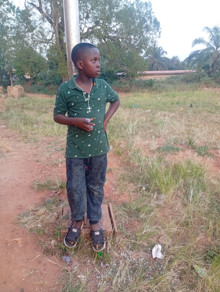 A young boy stands outdoors with his hand on his hip, wearing a green patterned shirt, dark patterned pants, and sandals. He has a rosary around his neck and looks off to the side. He stands on a small wooden platform next to a utility pole. The background features trees, grass, and a low building.