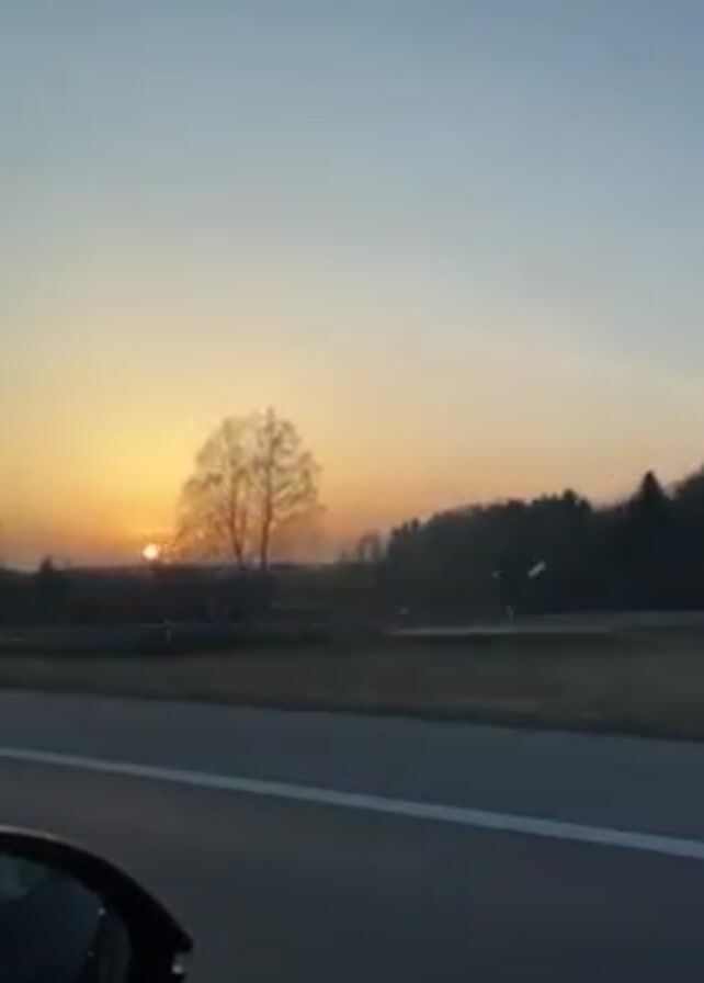 The video depicts a sunrise viewed from a moving car. The sun is visible on the horizon, obscured slightly by the branches of bare trees silhouetted against the sky. A highway is visible in the foreground, with guardrails and a line of dark green foliage. The sky transitions from a pale blue at the top to orange and yellow near the horizon. A contrail streaks across the sky above the sun. The car’s side mirror is visible in the lower left corner of the frame.
