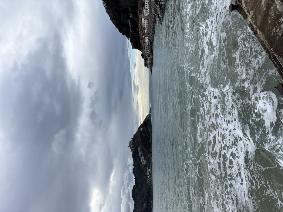 A high-angle, off-kilter shot shows a turbulent sea churning with white foam. On either side, land masses rise dramatically; one with buildings clinging to its slope, the other topped with a structure. A heavy, overcast sky dominates the scene, hinting at stormy weather. A concrete structure occupies the extreme right, possibly a pier.