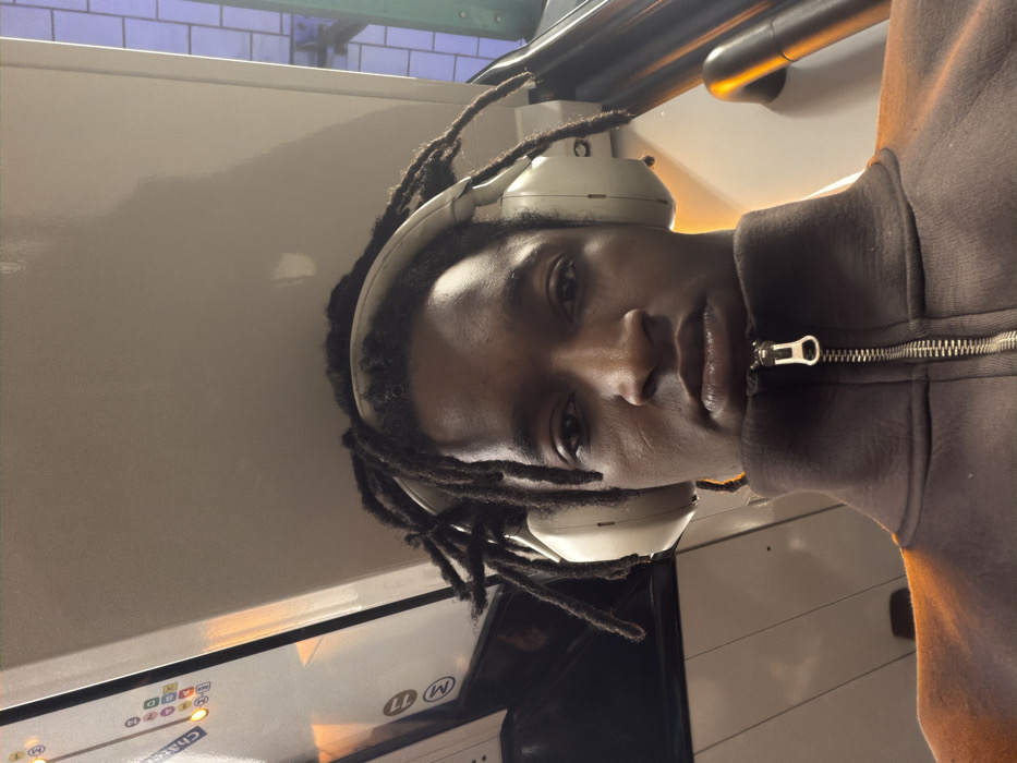 A close-up image depicts an adult male from the chest up, situated within the interior of a Paris Metro train in Paris, France. The subject has dark skin, dreadlocks, and wears off-white over-ear headphones. He is dressed in a dark brown, high-collared sweatshirt secured by a silver-toned zipper. A linear scar is visible on his left cheek. The background consists of the train's light-colored interior paneling. In the upper left, a white panel displays a partial diagram containing the text "Chatelet" and circular icons indicative of Paris Metro lines (e.g., 1, 4, 7, 11, 14, M). A segment of a blue-tiled wall, consistent with Paris Metro station architecture, is visible in the upper right background, alongside a dark, possibly metallic, vertical pole. Ambient orange lighting is present, reflecting off surfaces.